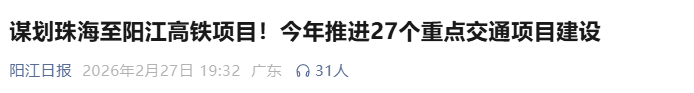 2022年11月,珠海市政府网站发布公告《询价邀请函——<珠海至阳江高铁规划方案研究>》(以下简称《公告》)。其中提到,珠海至阳江高铁,是联系粤港澳大湾区深港极点,澳珠极点与粤西地区的高铁通道。